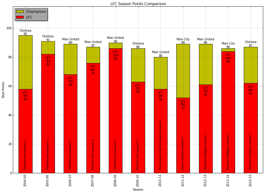This post describes Liverpool Football Club's premier league performance in seasons 2004-05 to 2014-15 with graphs generated from publicly available data. The seasons cover 11 years, from Rafael Benitez' first match of season 2004-05 in August 2004 to Brendan Rodgers' final match of season 2014-15 in May 2015.