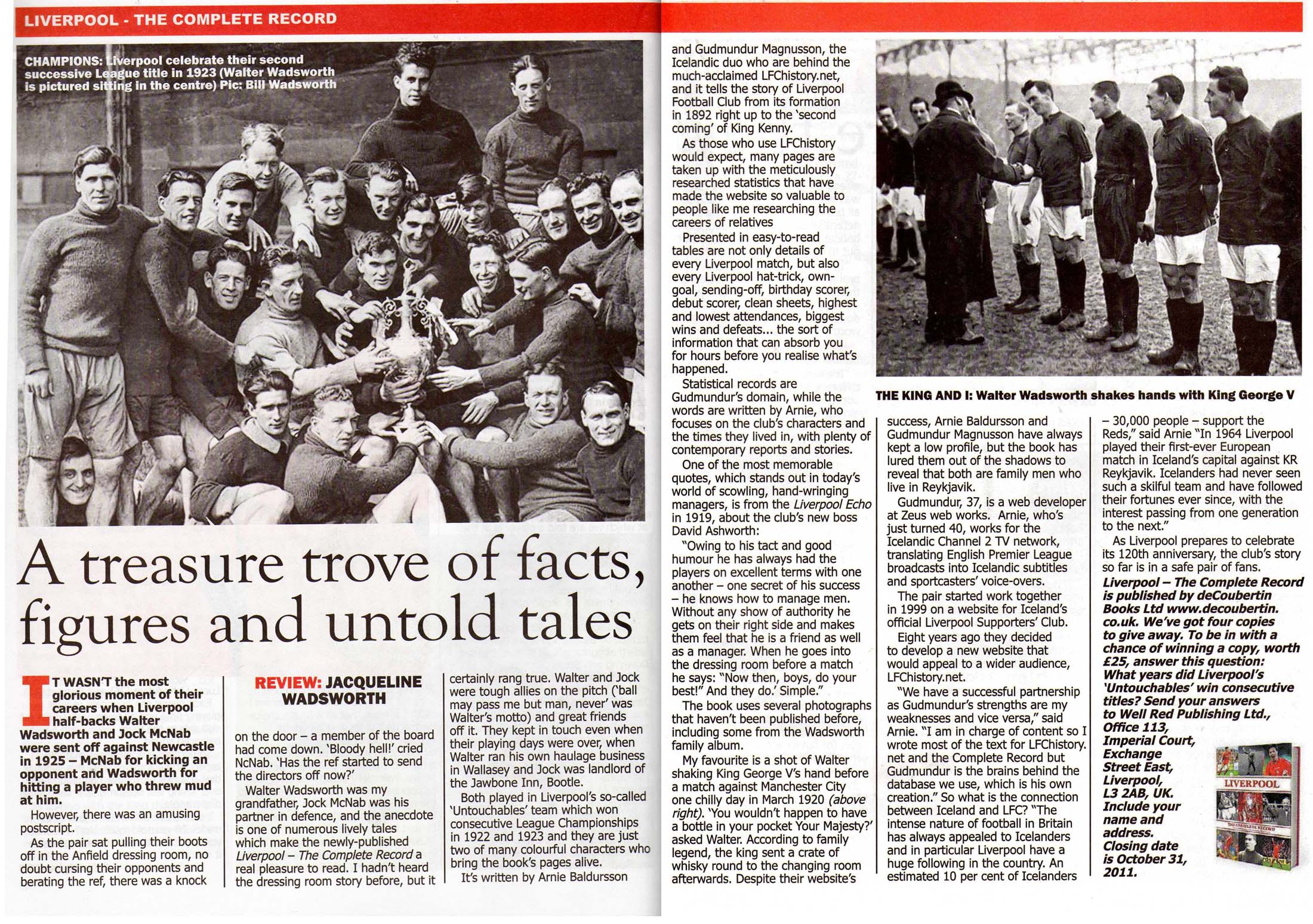 Article from the excellent Well Red magazine in October 2011. Review of Liverpool: The Complete Record by Jacqueline Wadsworth, granddaughter of Liverpool hard man, Walter Wadsworth.