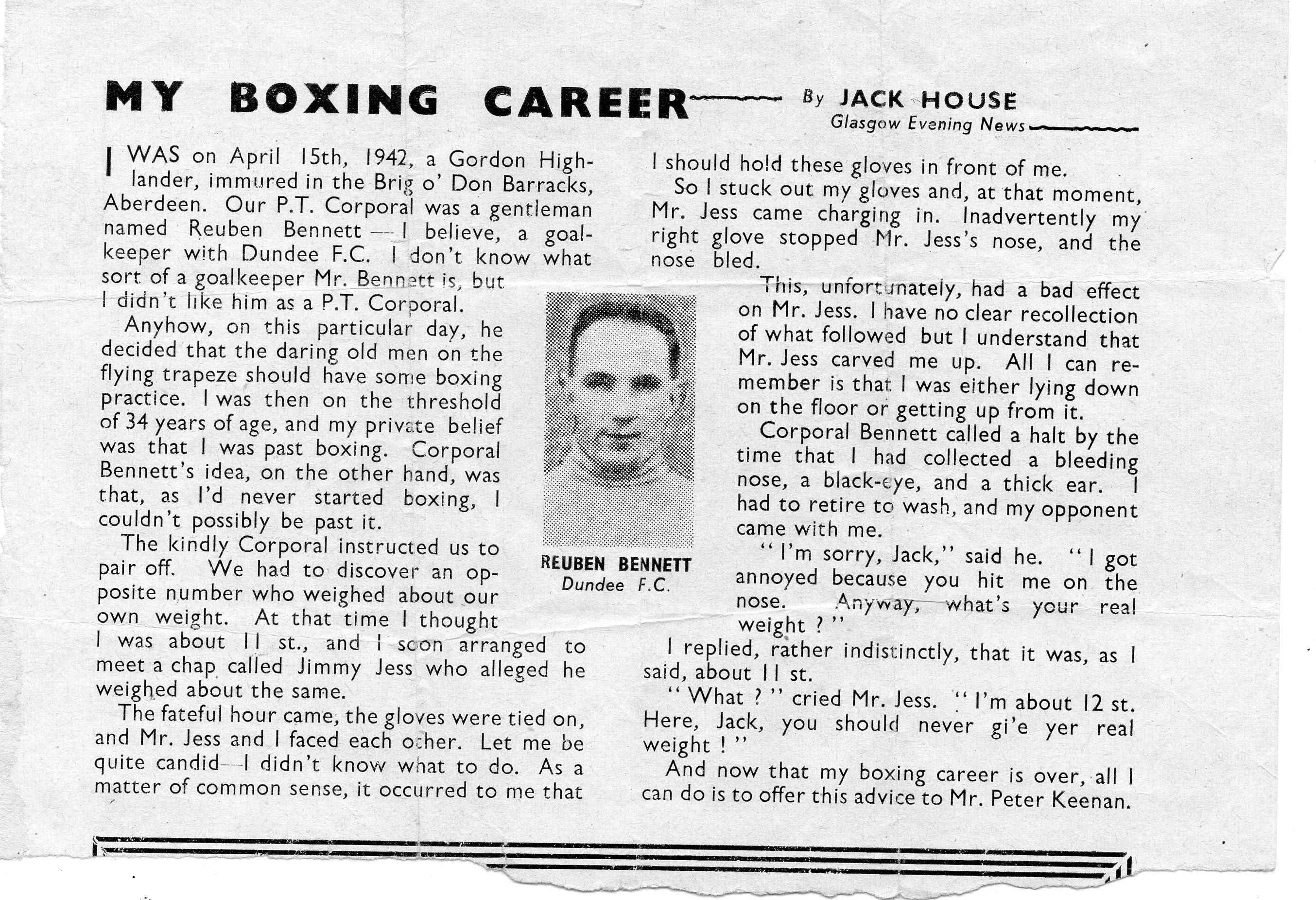 Apart from his talents and abilities as a player, coach or manager, Reuben Bennett was also a storyteller. In this he was not alone, because most footballers no matter of what level all have stories to tell. But Reuben was a football professional for over 50 years, plus he spent six years of war in the Army. So his fund of tales and anecdotes was gleaned from a rich harvest of experiences.