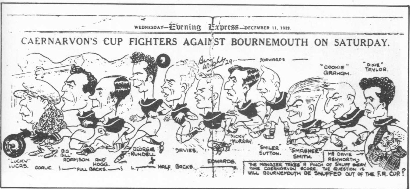 These idiosyncrasies made a gift for cartoonists – here he is, bottom right, while manager of Caernarvon Athletic! Note the flat cap and the portrayal for Ashworth's fondness for snuff. Copyright Evening Express.