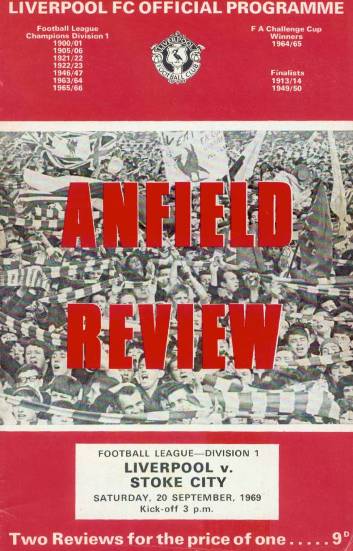 For Stoke's visit Liverpool produced their typical 16 page Anfield Review which also contained a 20 page insert "Football League Review", that appeared in a lot of clubs programmes at the time. Page three had a brief article commenting on how Liverpool's goals were being shared out throughout the side. Pages 4 and 5 have a welcome to the visitors. The Stoke side of the time contained Gordon Banks, Mike Pejic, Dennis Smith, Jimmy Greenhoff, Peter Dobing and George Eastham.