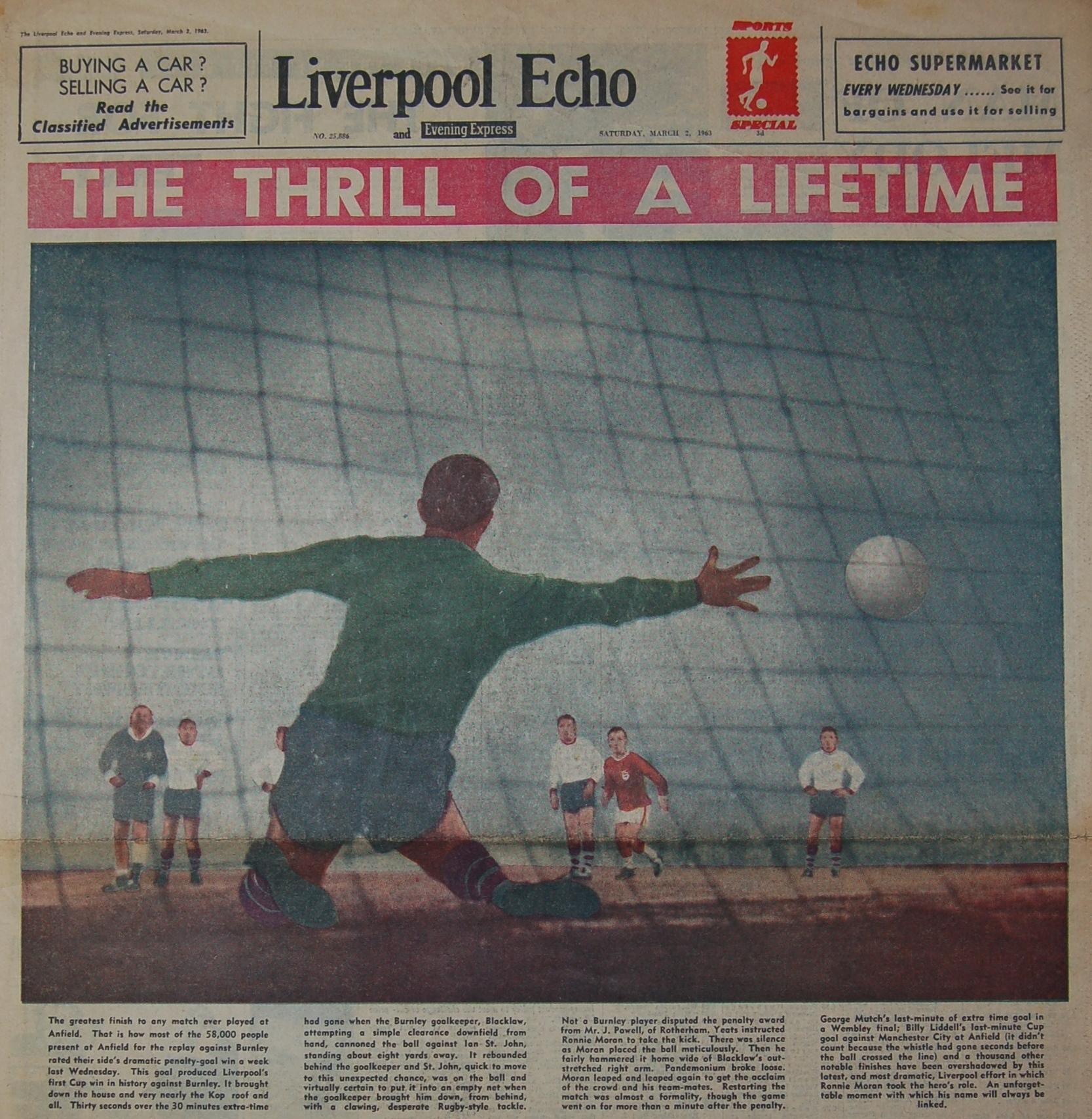 “FA Cup replay with Burnley; we went there straight from school,” he says. “Ronnie Moran got the winner with a penalty blasted into the roof of the net at the Kop End. For some reason all the other kids in the Boys' Pen started laughing at us and it was only then I realised we were wearing our St Francis Xavier school scarves: maroon and blue, the same colours as Burnley's.” Never before had one boy felt so naked wearing so many clothes.