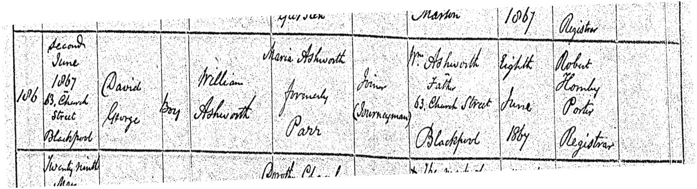 Born 2 June 1967, Layton-with-Warbreck, son of William Ashworth, joiner, and Maria, daughter of Mathew Parr, fishmonger, who married Blackpool 23 July 1866. Witness Mary Ashworth his sister. DGA was baptized 30 June in St Nicholas, Newchurch in Rossendale, son of William, a joiner, of Blackpool