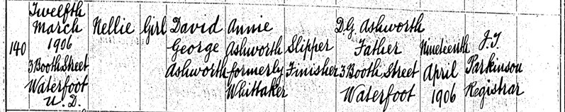 Their third child, Nellie, born Waterfoot in Haslingden, reg’d June quarter 1906.