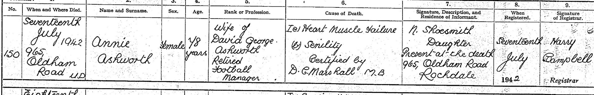 Annie Ashworth died 17 July 1942, then of 968 Oldham Road, Rochdale, Buried Newchurch, Old Ground, grave number 906, 907.