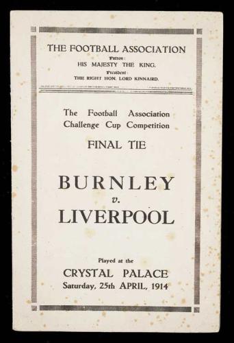 At their fourth time of trying, in 1914, they at last won an FA Cup semi-final, beating Aston Villa 2-0 at White Hart Lane. Their reward was a place in the Final against Burnley. It was the last of the 20 finals to be played at the Crystal Palace and it was also the first time that a reigning monarch had attended the showpiece match of the English football season. George V attended the game in his role as patron of the Football Association. The game was played on 25th April with 72,778 people in attendance. Burnley ended up receiving the trophy from the King by winning 1-0. This was the first and only time that they have lifted the FA Cup. They were also the first side to have won it by beating top division clubs all the way to the final. The match programme from the game is very sought after, not only by collectors of the two clubs involved, but also by big match collectors. Any pre-first world war programme is rare and therefore quite valuable. This is more the case with those from FA Cup finals. The programme consists of just four pages with black print on white paper. The front page has the match details. The inside cover lists the programme of music that was to be played by The Band of His Majesty's Irish Guards and The Band of 1st Battalion King's (Liverpool) Regiment. This included Carmen, Land of Hope and Glory and When the Midnight Choo-Choo, among others.