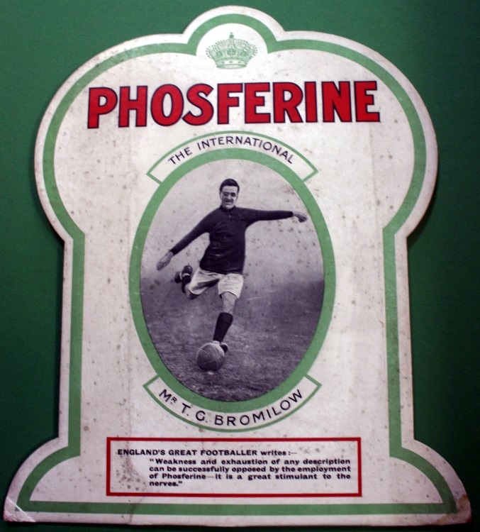 Dating from circa 1920, this advert for Phosferine features a quote from Tom Bromilow, former player for Liverpool and England.