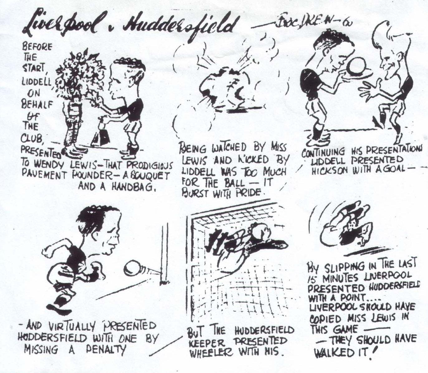 This game came right at the end of Billy's career. He only went on to make 6 further appearances after this Huddersfield game on 19th March 1960. Liddell's kick burst the ball after only four minutes of play. He made a goal for Dave Hickson after 13 minutes. Tommy Leishman added another only three minutes later. Liverpool were 2-0 up, but allowed Huddersfield to equalize 2-2. Liddell could have scored Liverpool's third from the spot, but his thunderous shot rebounded off the upright and the ball ended up in the middle of field. Such was the power of Liddell's kick!
