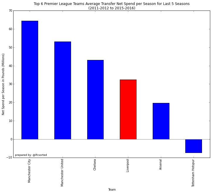 Let's compare the average net spend of the top 6 teams for the last 5 seasons using data from