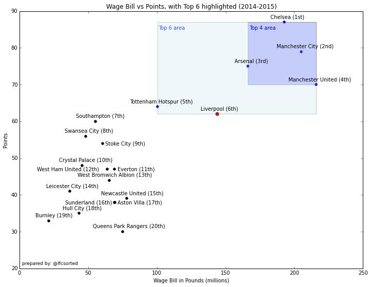 the league title? The graph below shows the wage bill for each club plotted against league points for last