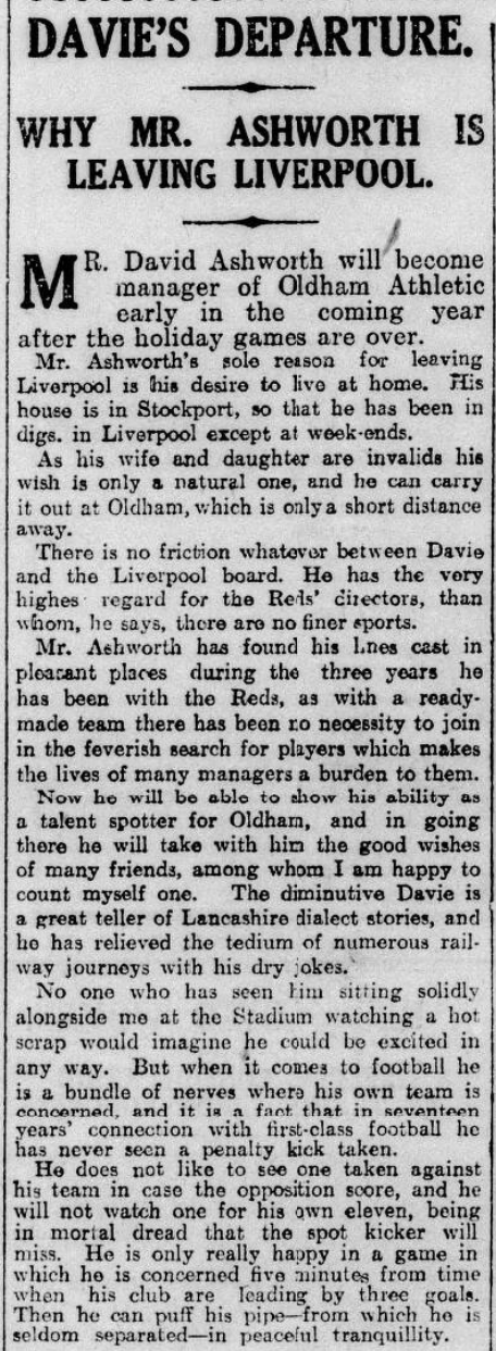 David Ashworth’s sudden departure from a position which must have been the envy of every other manager in the country to an Oldham Athletic then twenty-first in the same league, and the lack of acrimony in the club which he was leaving in the lurch, have not been easy to explain. Two theories have been put forward. The less convincing is that he had an inclination to help an underdog, and Oldham (a club he had nurtured from its birth) was in trouble at the time. Oldham had recently been re-formed when he joined in 1906, but he stayed for eight years with considerable success. Stockport County was in Division 2. Liverpool was also in some difficulty when he joined in 1919. However, changes in his subsequent managerial career are more easily explained by failures (especially financial) on the football pitch rather than a figure of a knight riding to a damsel’s distress.