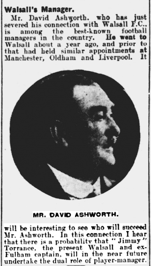 Attendances at Walsall doubled at first, but even though he was allowed to choose the team, new manager bounce did not last long, and some directors had to pay the players’ summer wages from their own pockets. Far from seeing Ashworth’s new players – some from Liverpool (including Ted Parry who was capped for Wales on 13 Feb 1926) and Oldham – as the foundation of a rise to Division 2, the directors saw them as a means to make a quick profit, ex-Liverpool international Archie Rawlings being sold to Bradford after only 23 appearances. The Watford Observer also noted that ‘some of his swans turned out to be geese’ and, amid falling gates, Ashworth resigned in February 1927. I have not discovered the nature of his employment until he joined Caernarvon sixteen months later – presumably he could fall back on unemployment benefit, a consequence of which might have caused him to accept the Walsall job in the first place. He was replaced three months later by James Torrance, one of the players he had recruited.