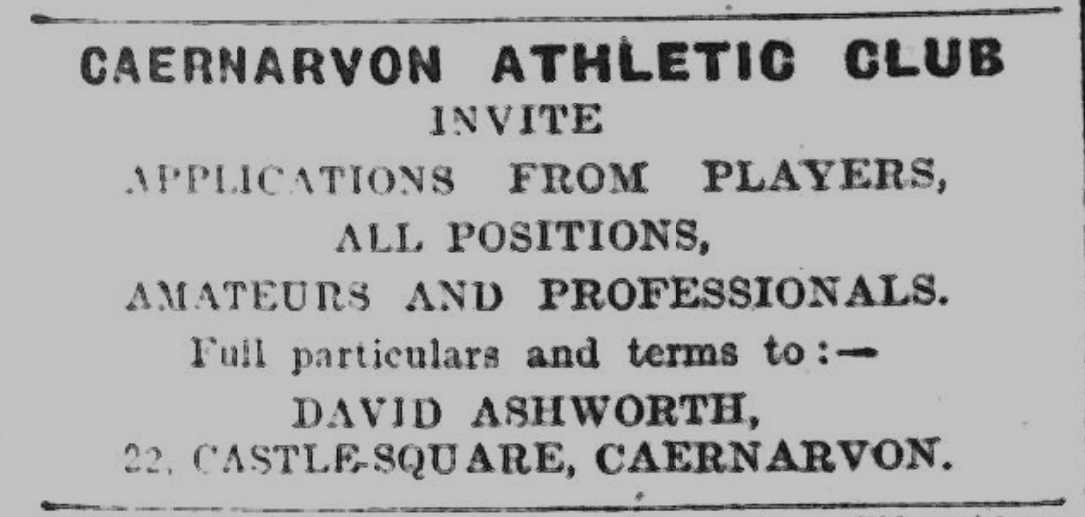 The Liverpool Evening Express evidently took an interest in David Ashworth’s career, on 6 June 1928 making a note on his appointment at Caernarvon. (The same paper is seen elsewhere in this article concerning his departure from Anfield, and indeed his departure from this life, the only paper to do so.) He almost certainly chose Caernarvon in response to a nationwide advert for a new manager, and in turn used the same method to recruit new players.