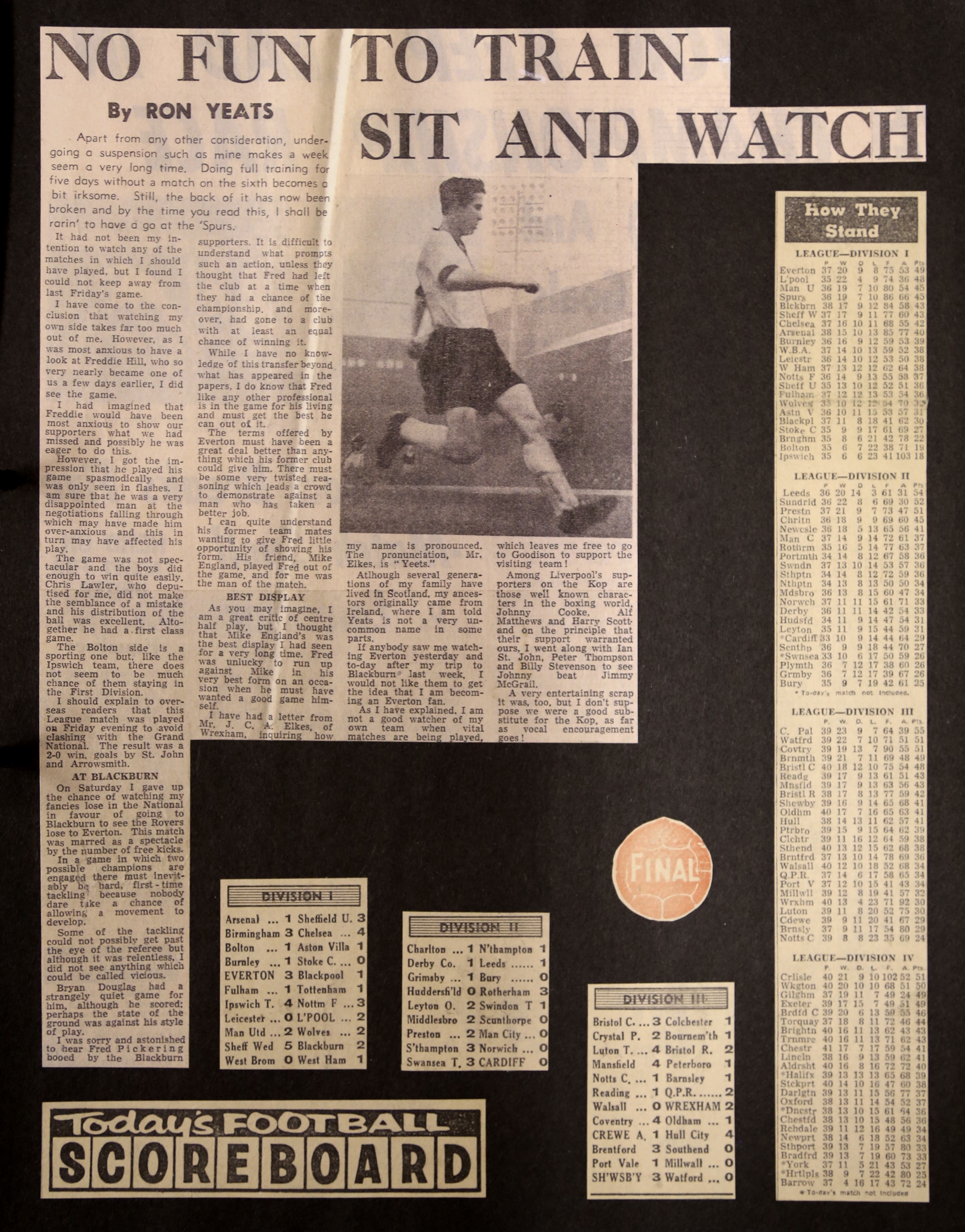 Suspension of the normal captain also gives others a chance to shine in the job – Steve Nicol stepped in when Ronnie Whelan was suspended, and Chris Lawler replaced Ron Yeats. It was surprising that Lawler was preferred to vice captain Gordon Milne but probably Shankly wanted to inspire the youngster - and so he did, as he was fantastic in the three games Yeats was absent. We have the rare privilege of being able to read Yeats’ own thoughts on the matter in his record of attending the match in Bolton on 20 March 1964.