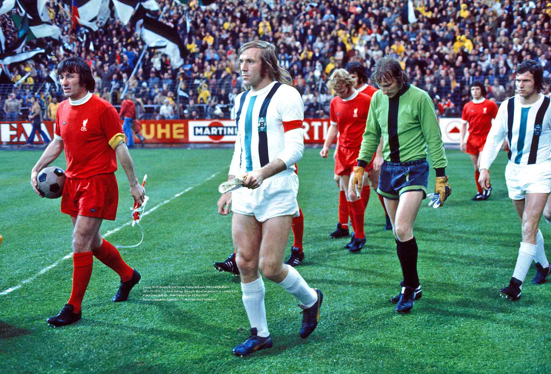 Mention of the armband raises the interesting question of when the practice began. It was, it seems, relatively recently. Articles about the history of the game might use the phrase ‘wearing the armband’ (meaning ‘to be captain’) but that does not mean one was actually worn. Search engines reveal some very beautiful examples and suggest that it became common practice in England in the mid-1980s, but it had originated on the continent earlier; Tommy Smith can be seen wearing one in the UEFA Cup final in 1973 against Gladbach.