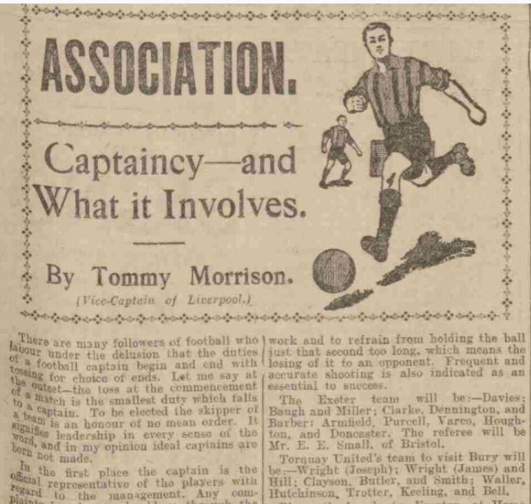 An excellent, insider’s view of captaincy was written by Tommy Morrison, LFC vice-captain, was published in the Exeter and Plymouth Gazette, 10 January, 1931, explaining the unwritten but very important role of the position. "Ideal captains are born not made" are very wise words.