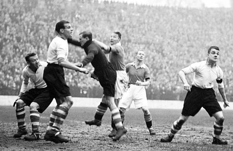 His aggressive approach to the game often resulted in injury, which was, in any case, an occupational hazard for the half-back line. With no substitutes allowed before 1965, there was considerable psychological pressure to soldier on when injured, which sometimes compounded the problem. Wounded half backs were sometimes put on the forward wing where they would do less damage! On 22 January 1938, against Sheffield United, Rogers was injured at the start, and was ordered to play the rest of the match with a bloody nose at outside left. Cajoled by the crowd, he shouted, ‘I want to go back but they won’t let me’. Later in the same match, Busby ‘had to go to the line for trainer C. Wilson to bandage his right thigh. When Busby returned, he took over the outside right position’. He was not in the team for the replay four days later nor against Preston a week later because he ‘could not walk upstairs without help. But in 48 hours the stiffness may disappear’. Against Chelsea on New Year’s Day 1938, Busby, ‘hurt just before the end, insisted on remaining although he was only able to limp about the field’.