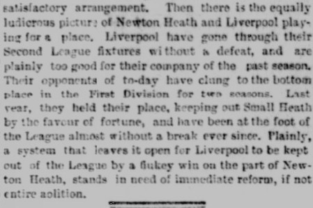 Another objection to these early tests could not be expected to arouse the sympathy of the modern Liverpool fan. As a result of knocking Newton Heath into Division 2, the system was then blamed for giving the city two clubs while depriving Manchester of any first-class football!