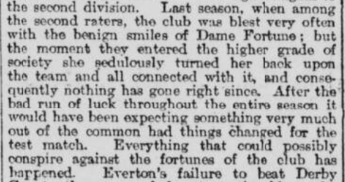 Sporting Life reminded readers that, ‘Two years ago, Liverpool had obtained promotion into the first division the league after a very successful record for the second. They failed to uphold their reputation in the higher sphere as many will also recollect, and it is to be hoped that better luck will attend them when they start on the heavier work of the first division next September.’