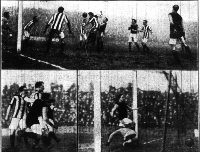 By this time, owing to the heavy rain, the ground was in a very sloppy condition, but the light improved, and there were a series of onslaughts on Campbell’s charge. Seven minutes after Thorpe’s successful shot, Mosscrop being again busy, the International won a corner, and in the ensuing tussle Pickering headed his first League goal.