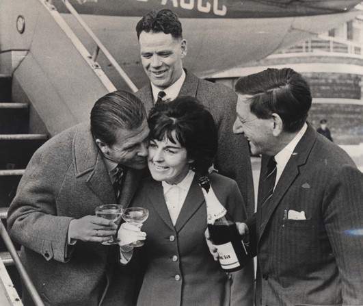 Two legends together in 1967. A lucky stewardess getting a kiss from Ferenc Puscas.