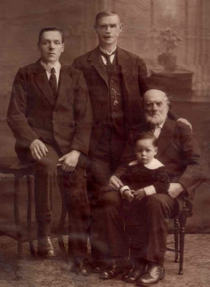 This is a picture of four generations. Bill with his father (James), grandfather and great-grandfather, William Beveridge. Billy is 2-3 years old in his velvet suit.