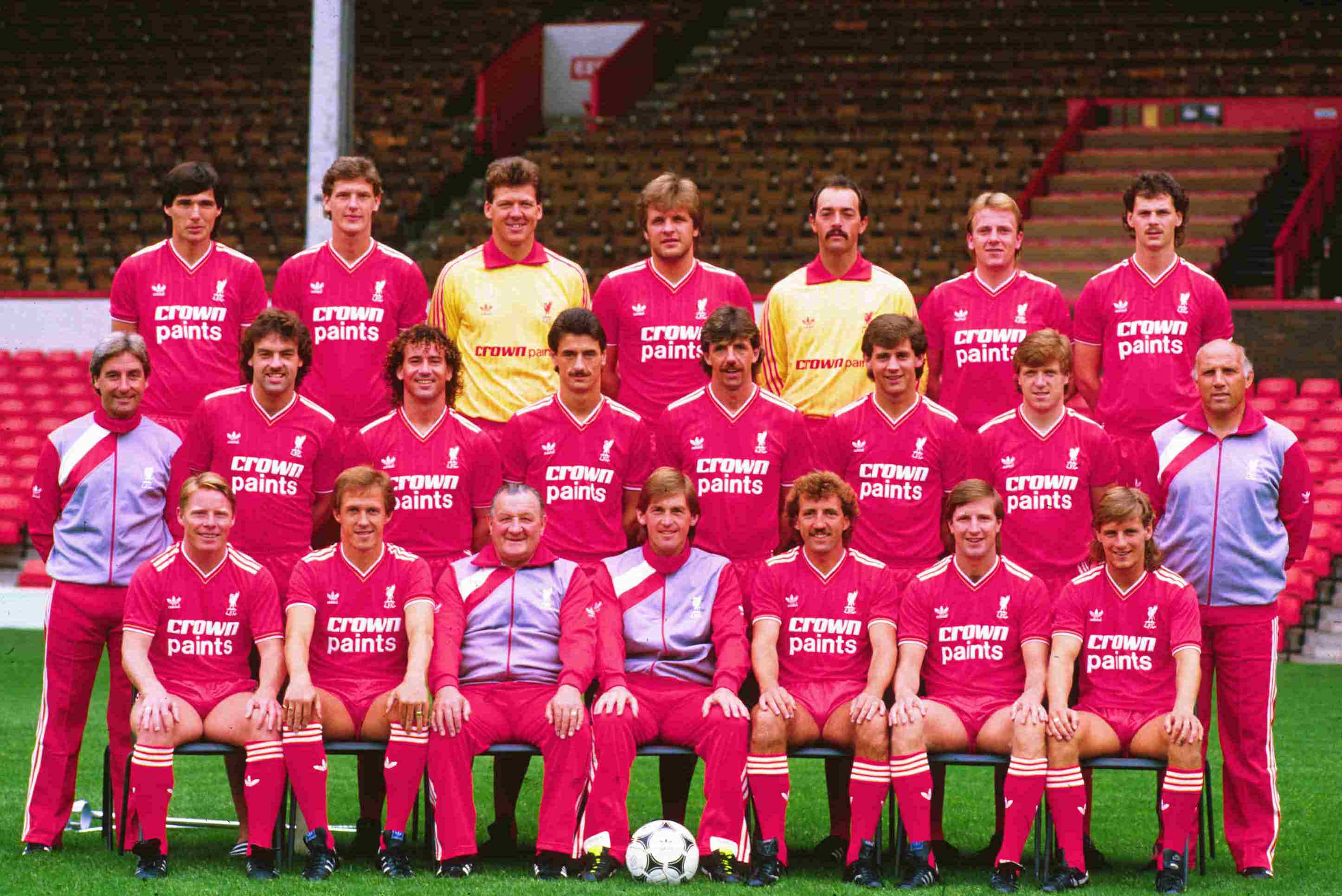 Middle row: Roy Evans (Trainer), John Wark, Craig Johnston, Ian Rush, Mark Lawrenson, Jim Beglin, Steve Nicol, Ronnie Moran (Trainer).